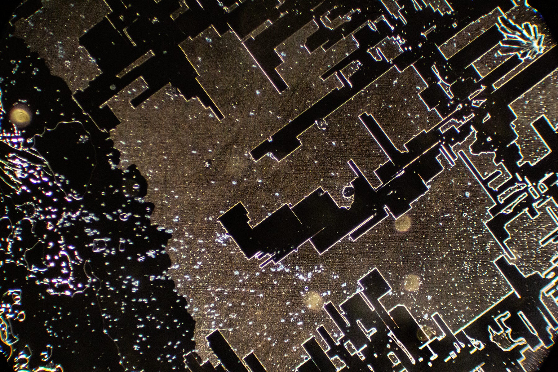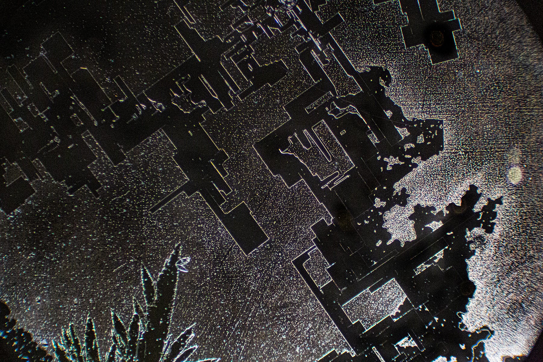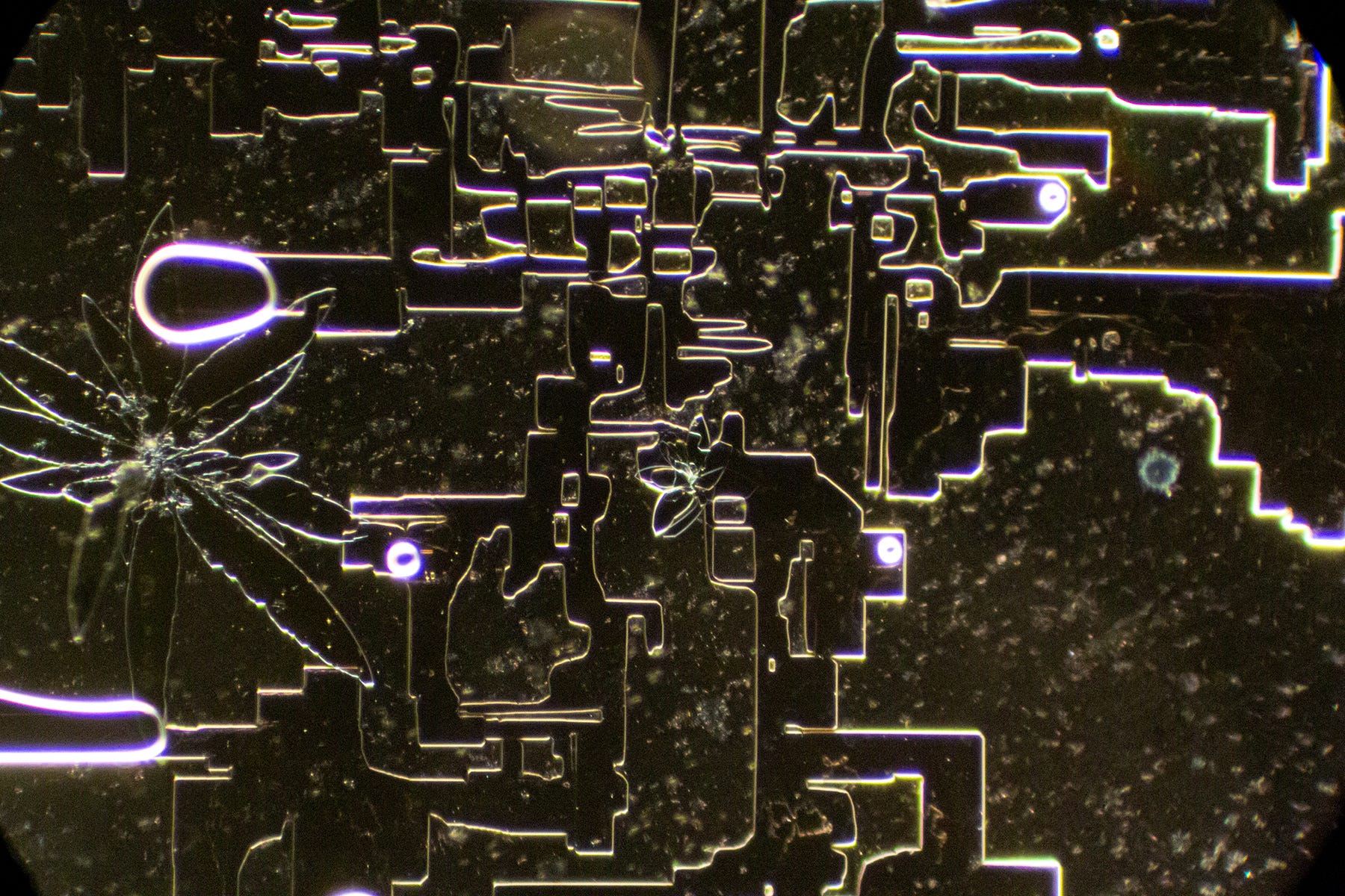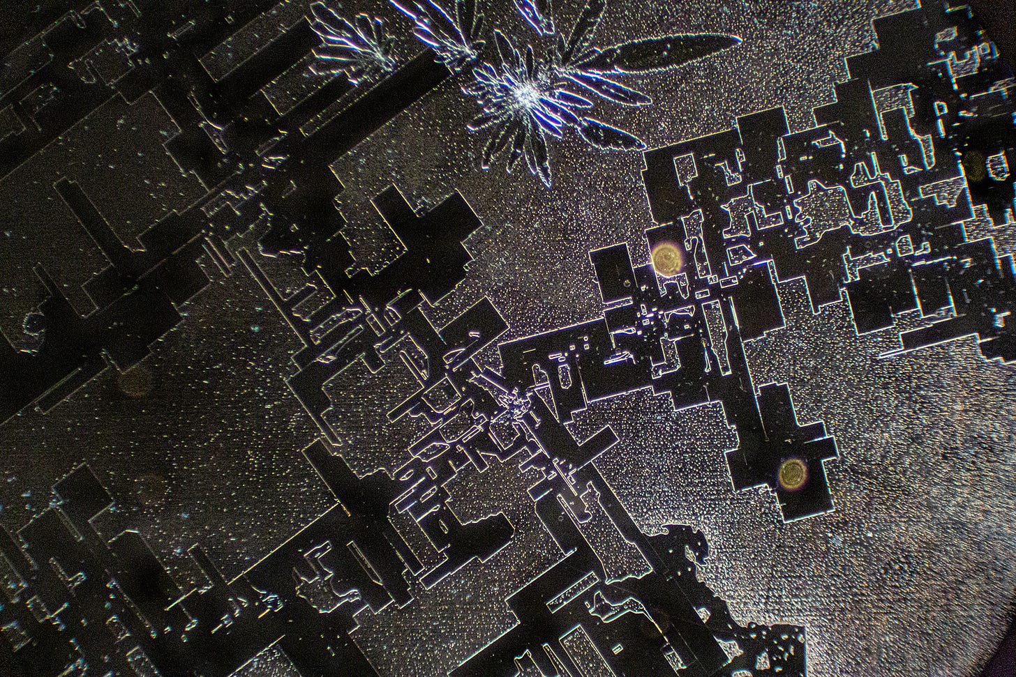 Now we see familiar Hydrogel Polymer-forming “Smart Cities” - my term for complex straight-lined and geometric shaped crystal formations that resemble birds’ eye architectural blueprints, runways or, circuit boards. Sometimes, these geometric formations degrade, which could indicate that Hydrogel Polymers are natural, rather than synthetic. Yes, the sodium may also contribute to the angular shapes.