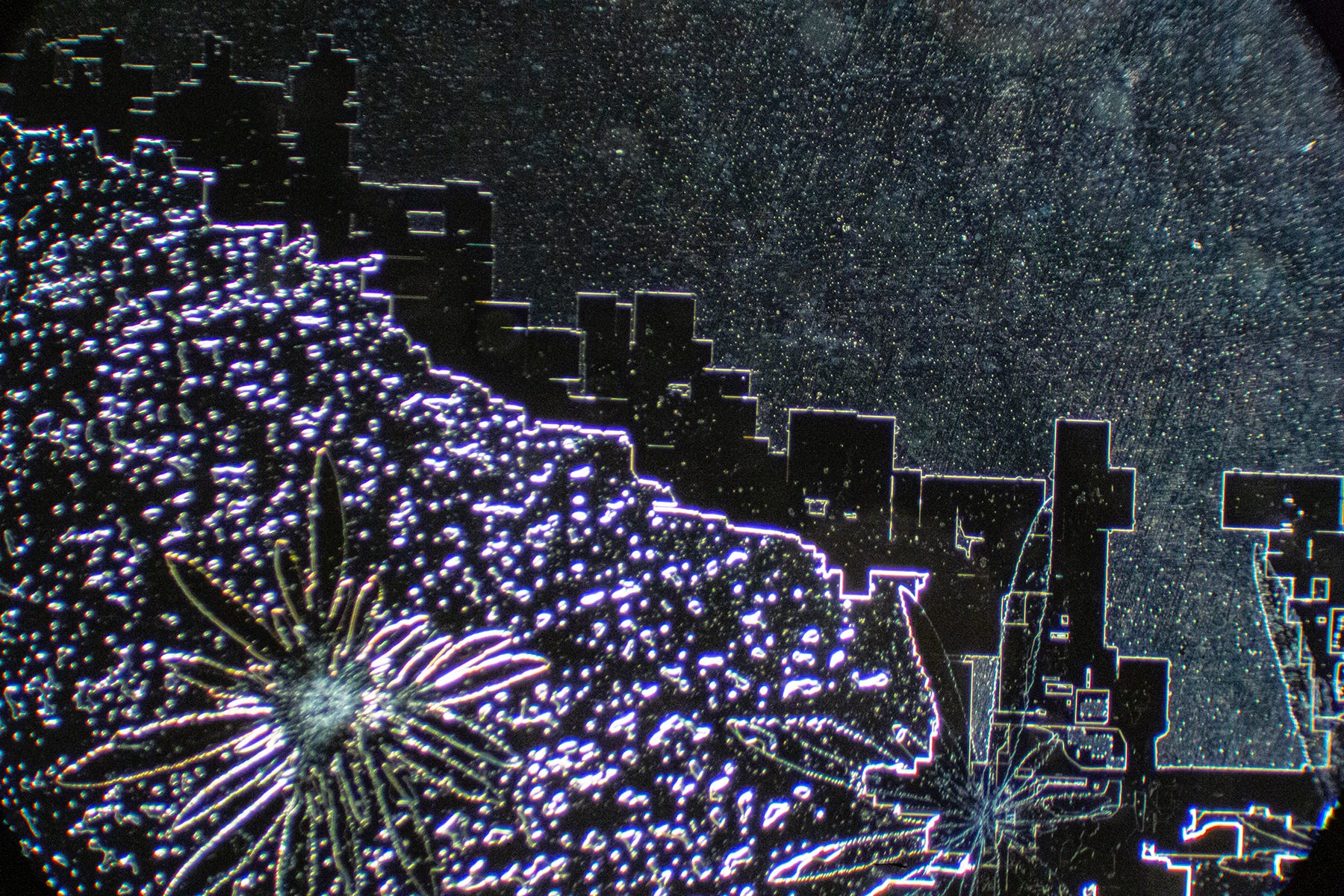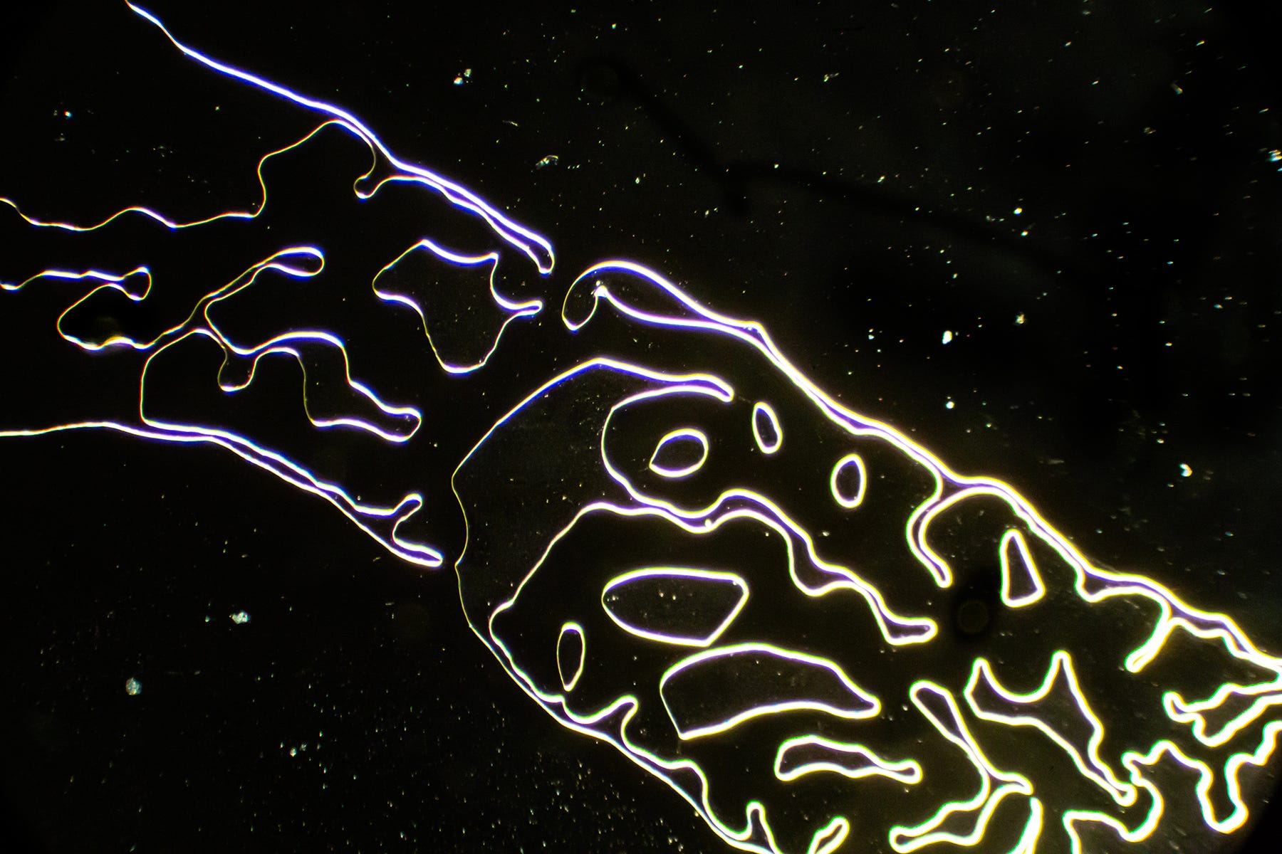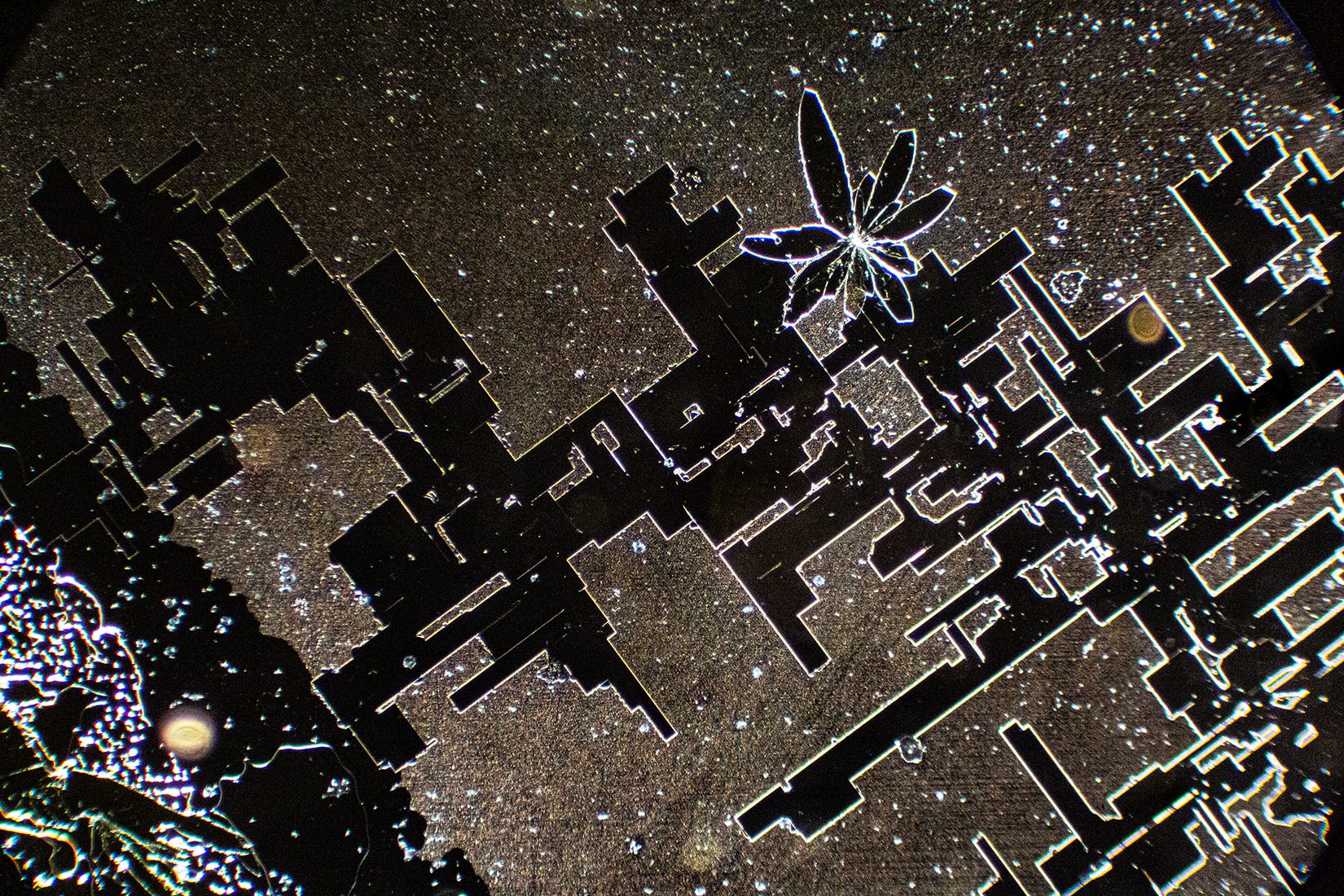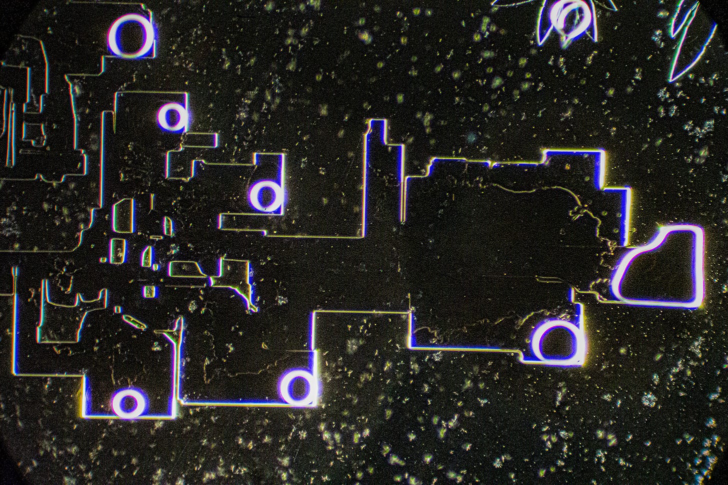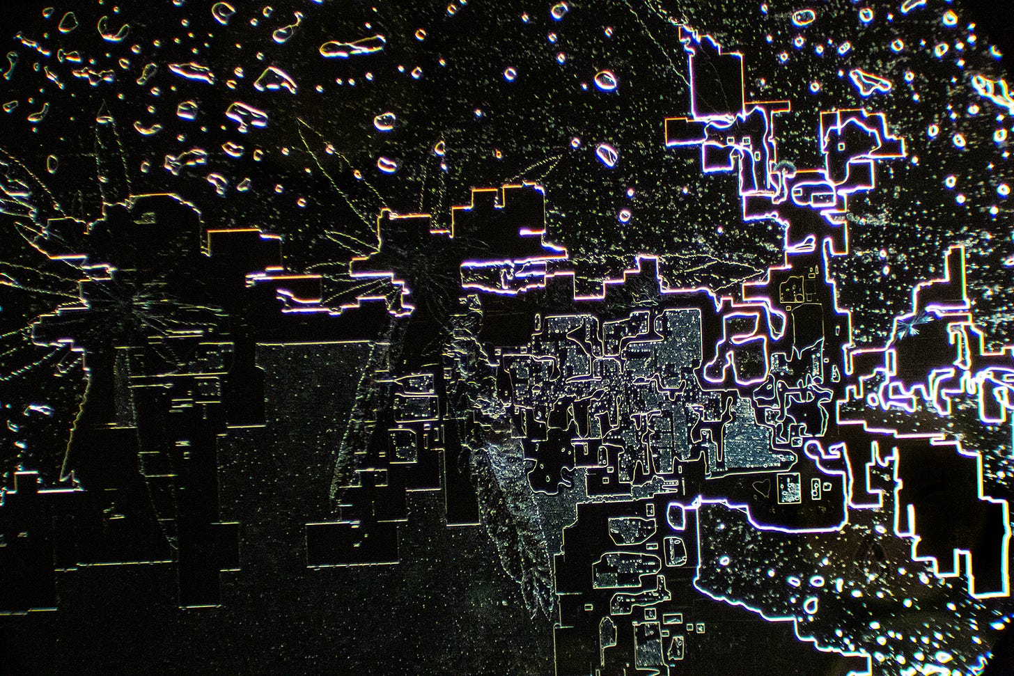Now we see familiar Hydrogel Polymer-forming “Smart Cities” - my term for complex straight-lined and geometric shaped crystal formations that resemble birds’ eye architectural blueprints, runways or, circuit boards. Sometimes, these geometric formations degrade, which could indicate that Hydrogel Polymers are natural, rather than synthetic. Yes, the sodium may also contribute to the angular shapes.
