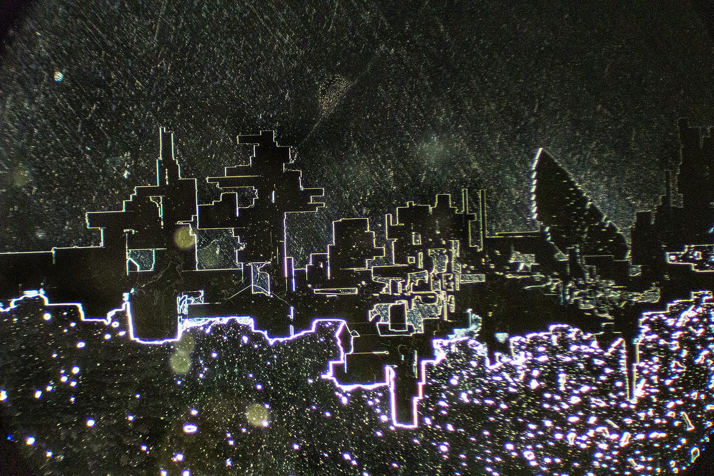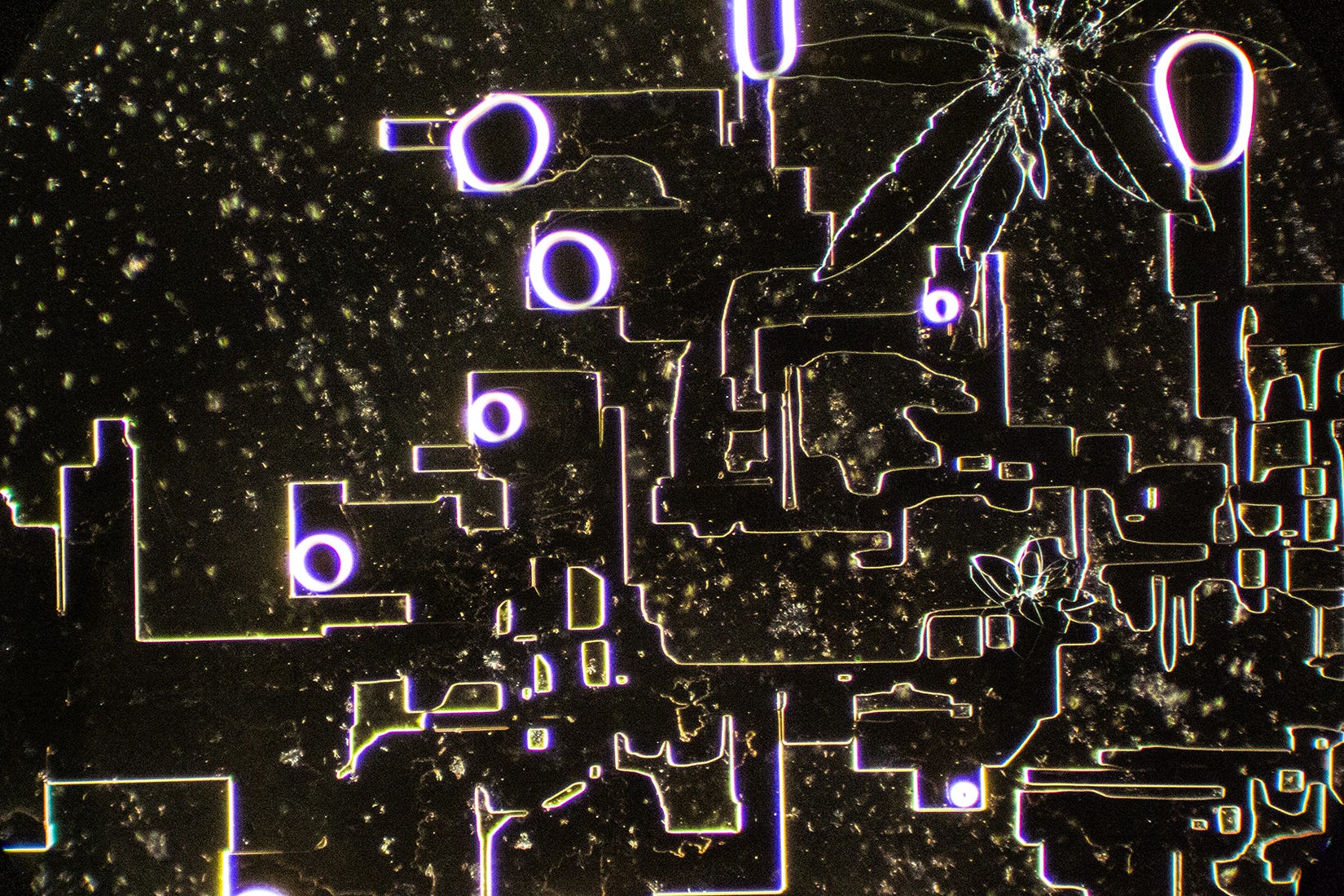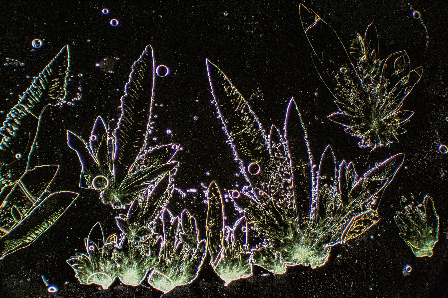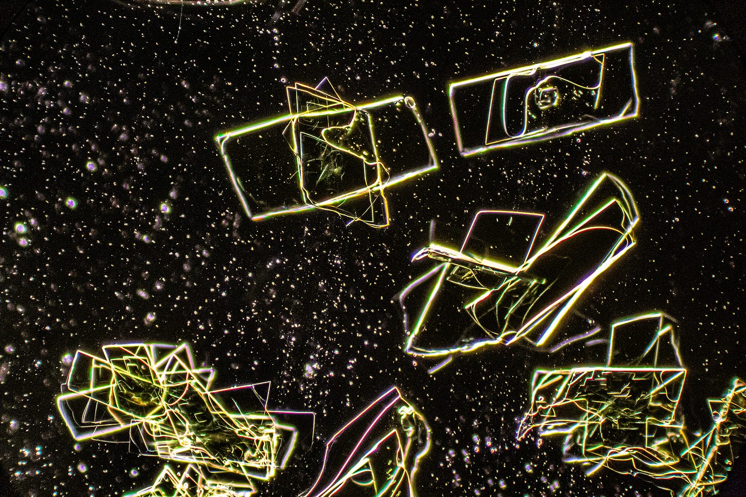 Now we see familiar Hydrogel Polymer-forming “Smart Cities” - my term for complex straight-lined and geometric shaped crystal formations that resemble birds’ eye architectural blueprints, runways or, circuit boards. Sometimes, these geometric formations degrade, which could indicate that Hydrogel Polymers are natural, rather than synthetic. Yes, the sodium may also contribute to the angular shapes.