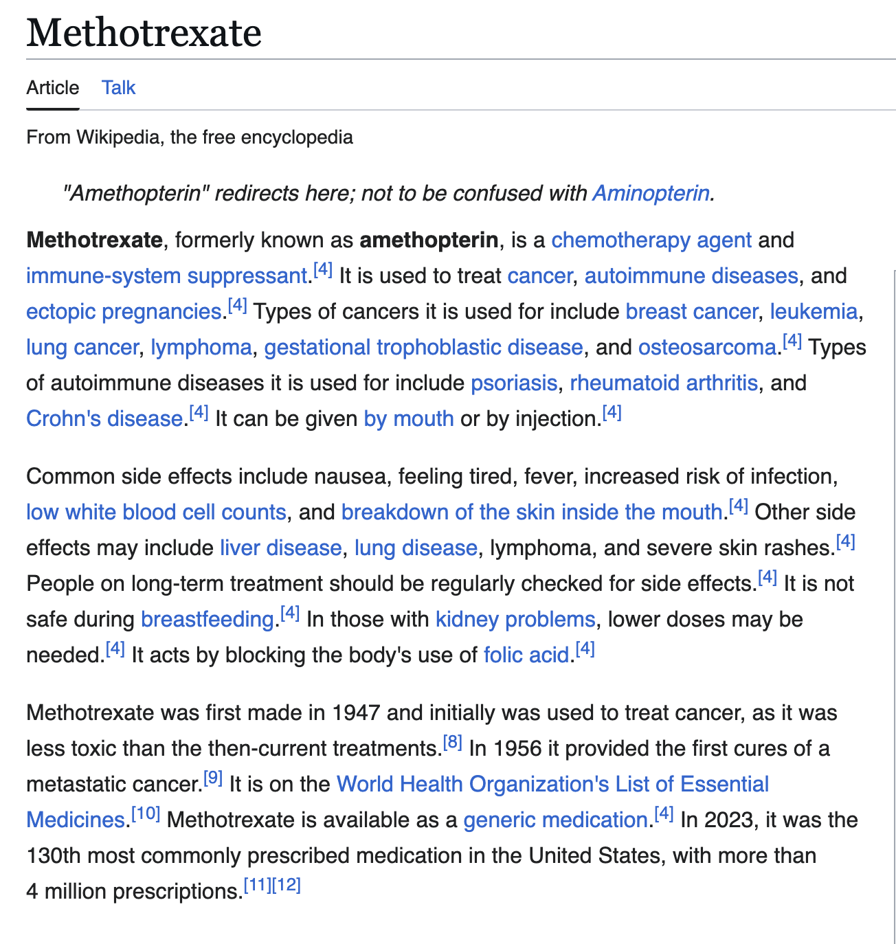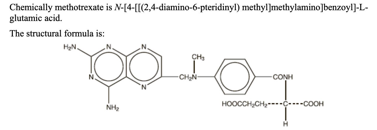 Methotrexate (MTX) is a immunosuppressant chemotherapy drug, previously known as amethopterin. Methotrexate interferes with the growth of certain cells of the body, especially cells that reproduce quickly, such as cancer cells, bone marrow cells, and skin cells. (But doesn’t harm other cells, kind of like Herbicides"??) Its also prescribed for Rheumatoid Arthritis.