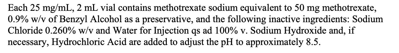 This sample was an intramuscular injectable. Trade names include Trexall, Rheumatrex, and Otrexup.