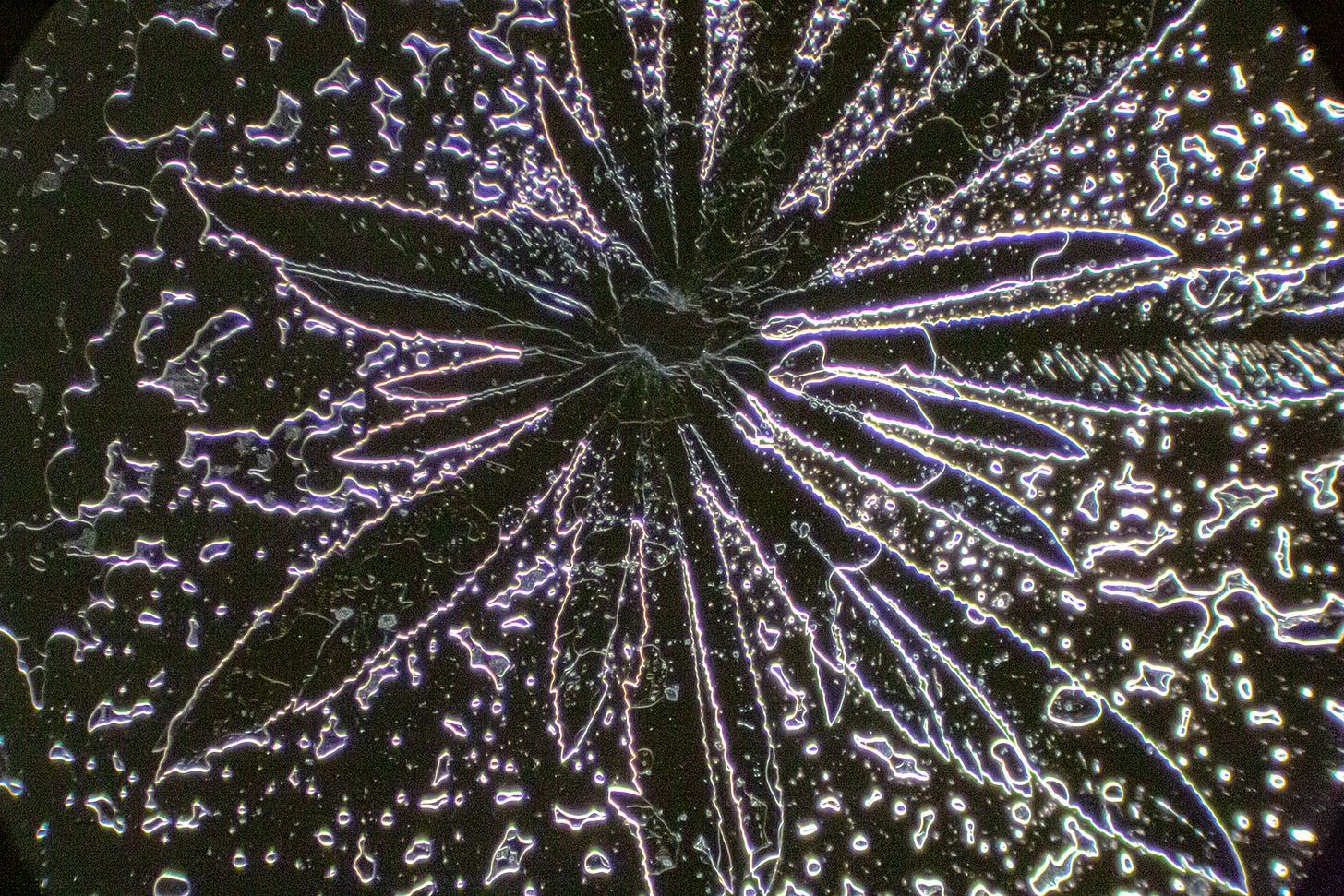 At first look, without a coverslip, I attempted to do the same kind of Sessile Droplet Evaporation process we do with Dental Anesthetics to see if the particles would assemble a formation of technology, a liquid crystal. This was a much thinner liquid than Dental Anesthetic injections.